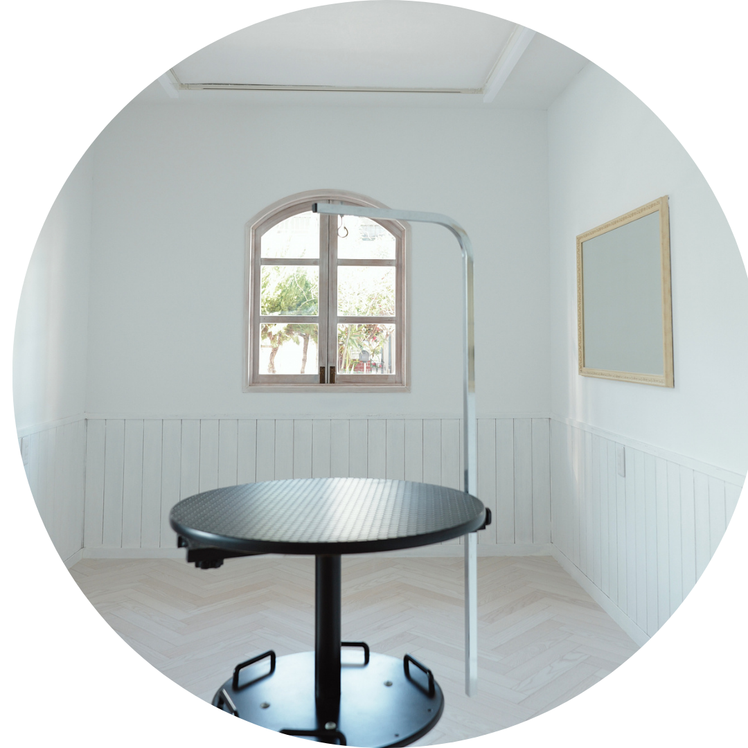 「落ち着いた空間で」「ワンちゃんと丁寧に向かい合い」「ご家族も安心できるお店」をイメージして、まるでお部屋の中でカットしているような雰囲気の小型犬専門のお洒落なドッグサロンをつくりました。