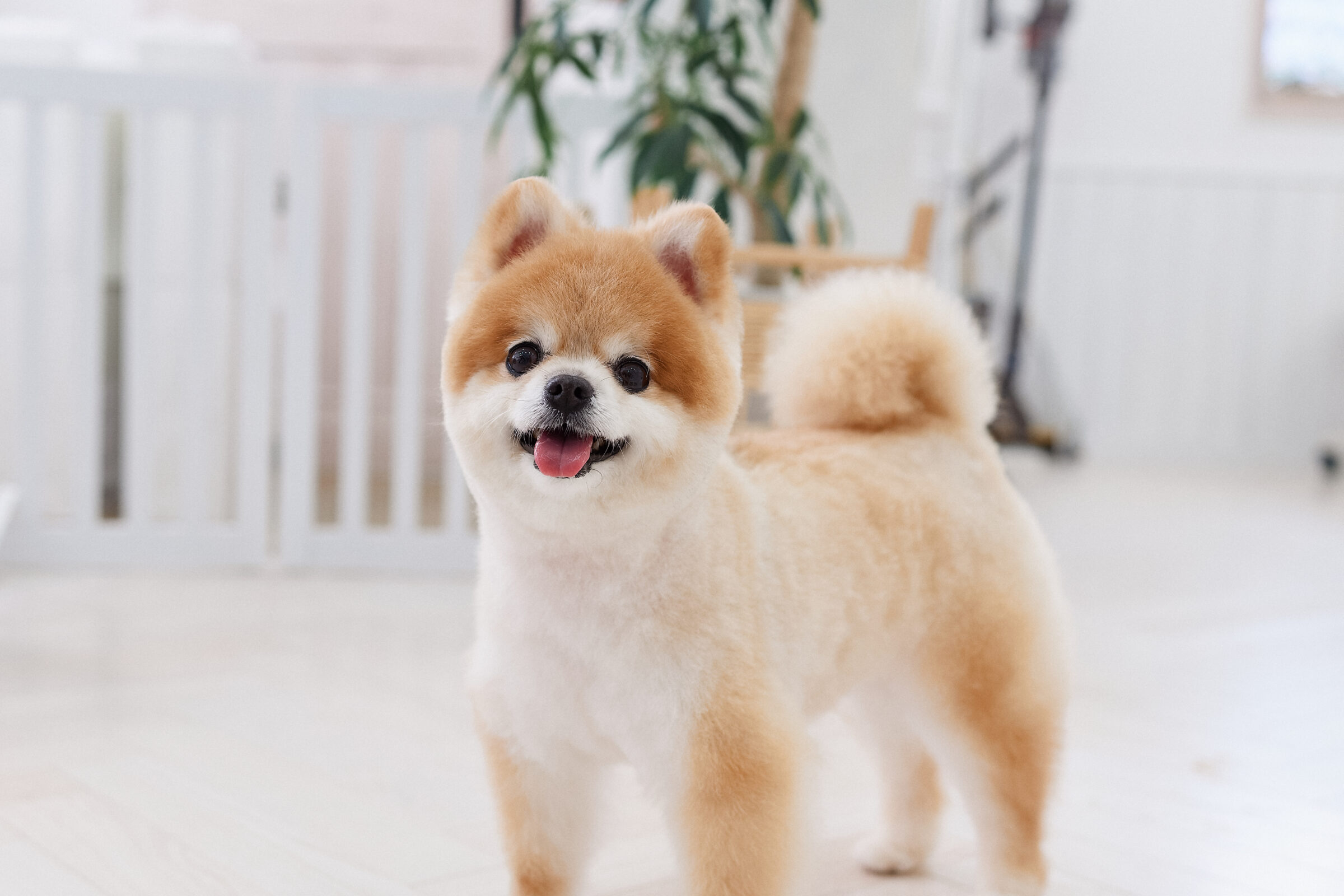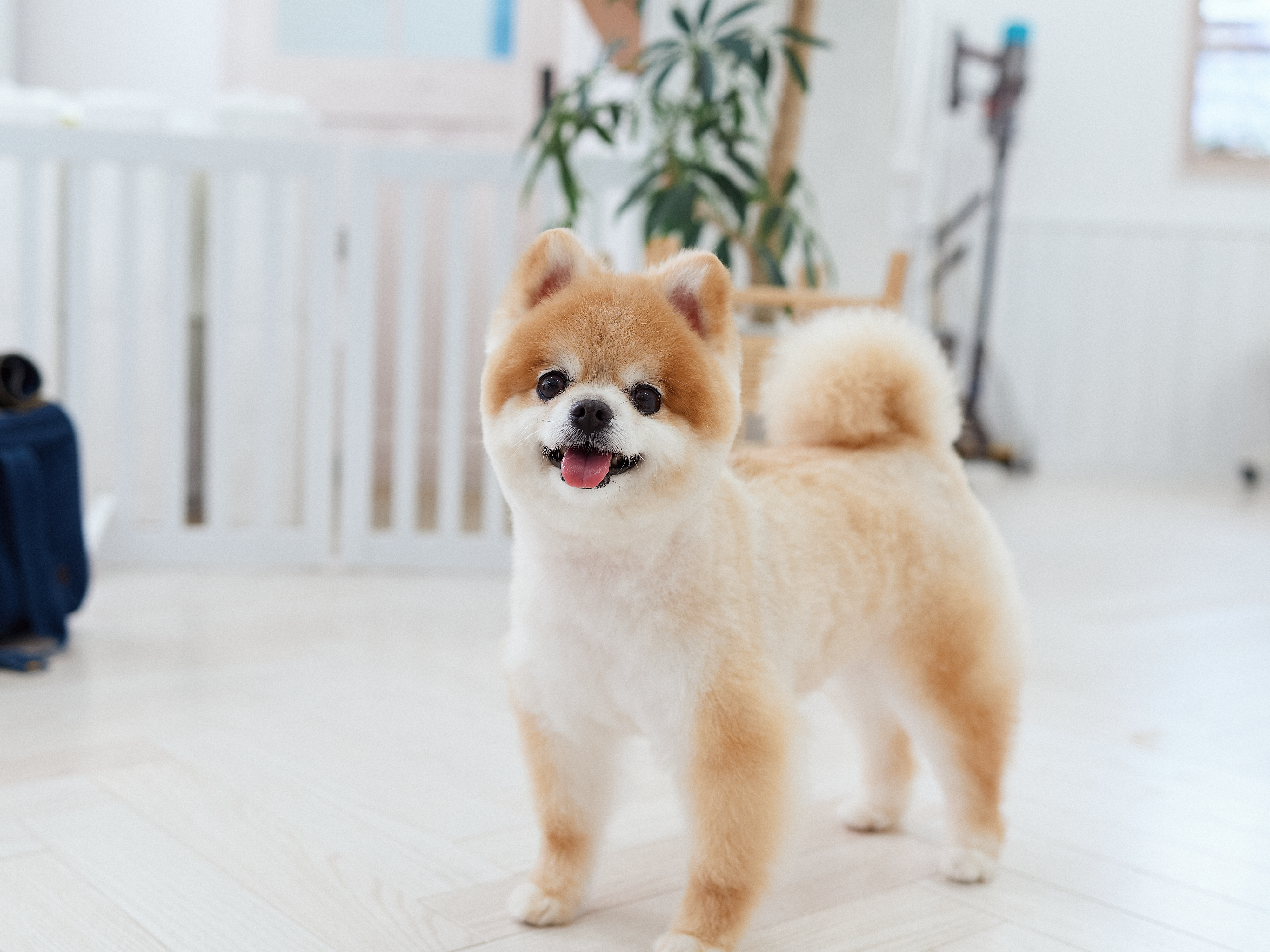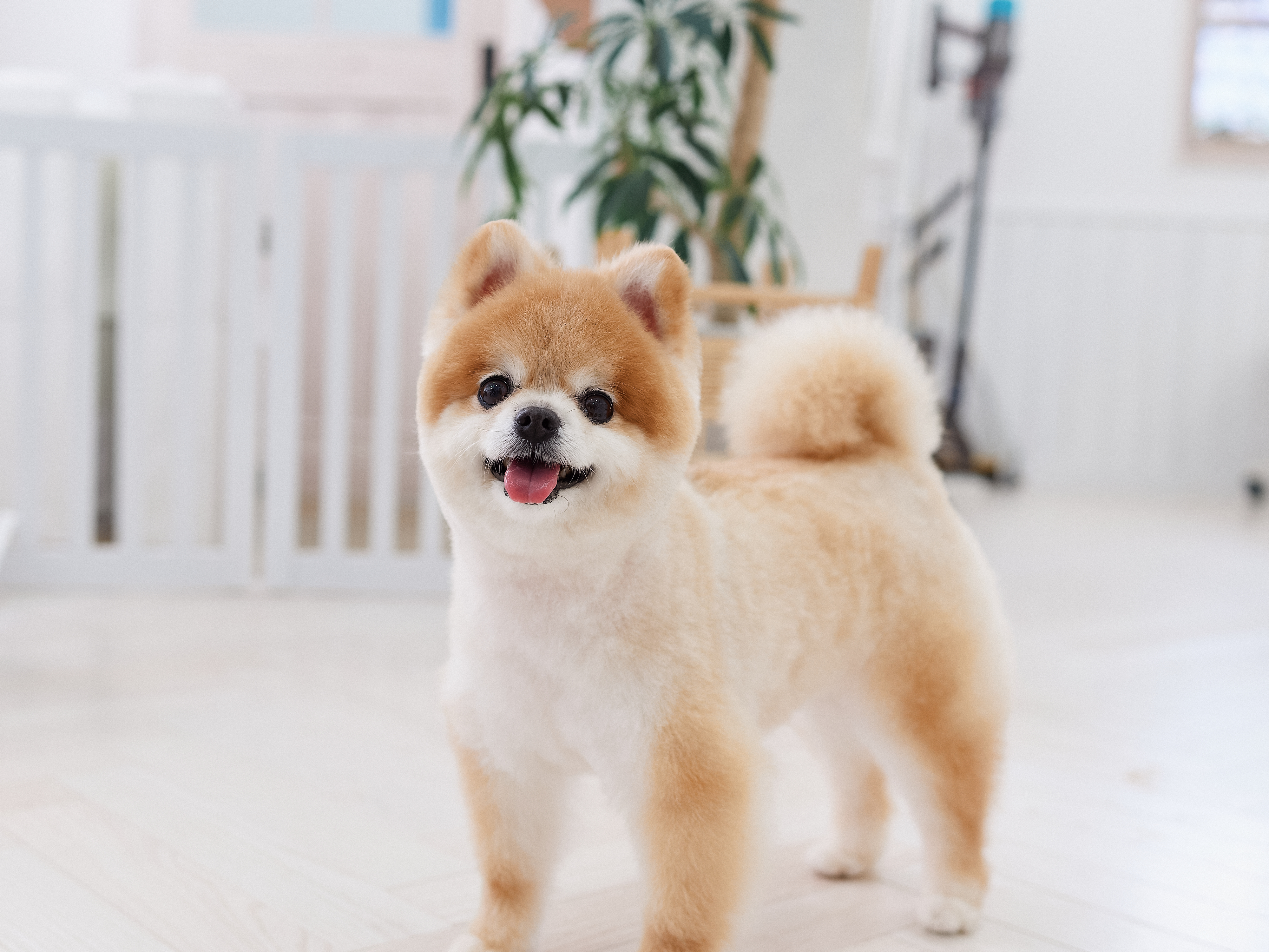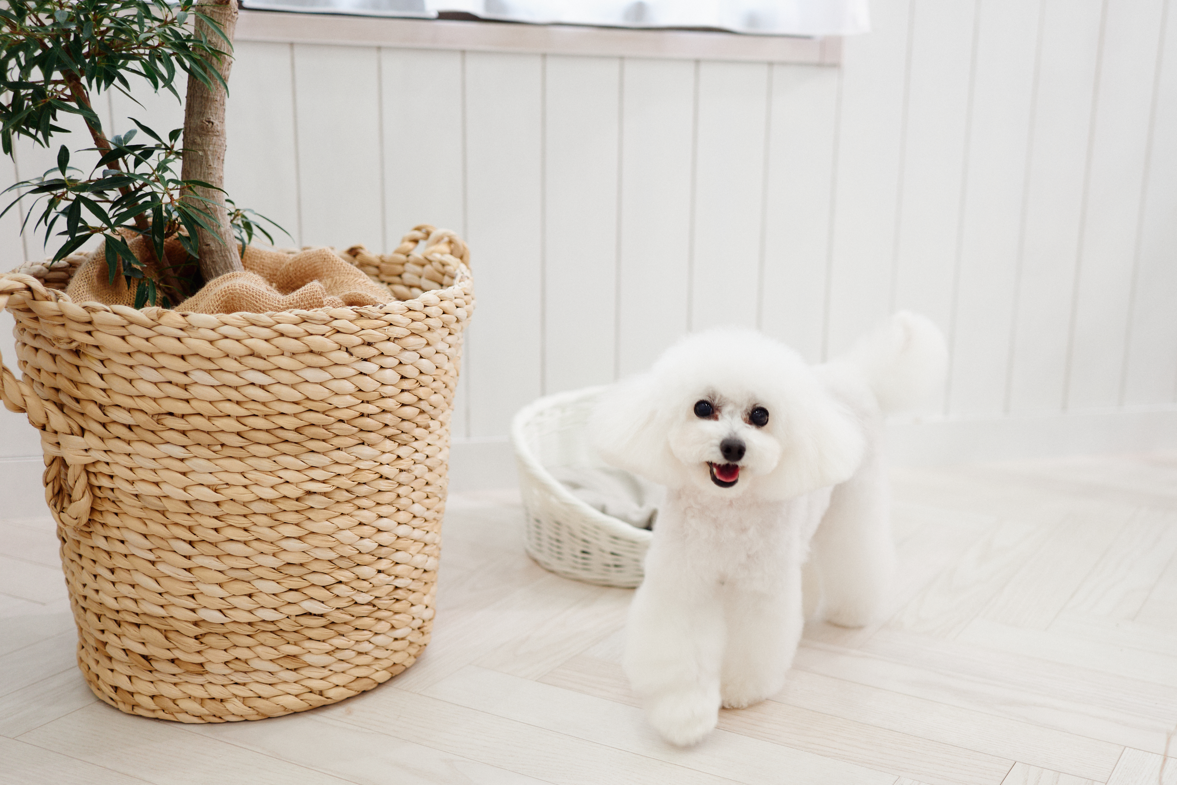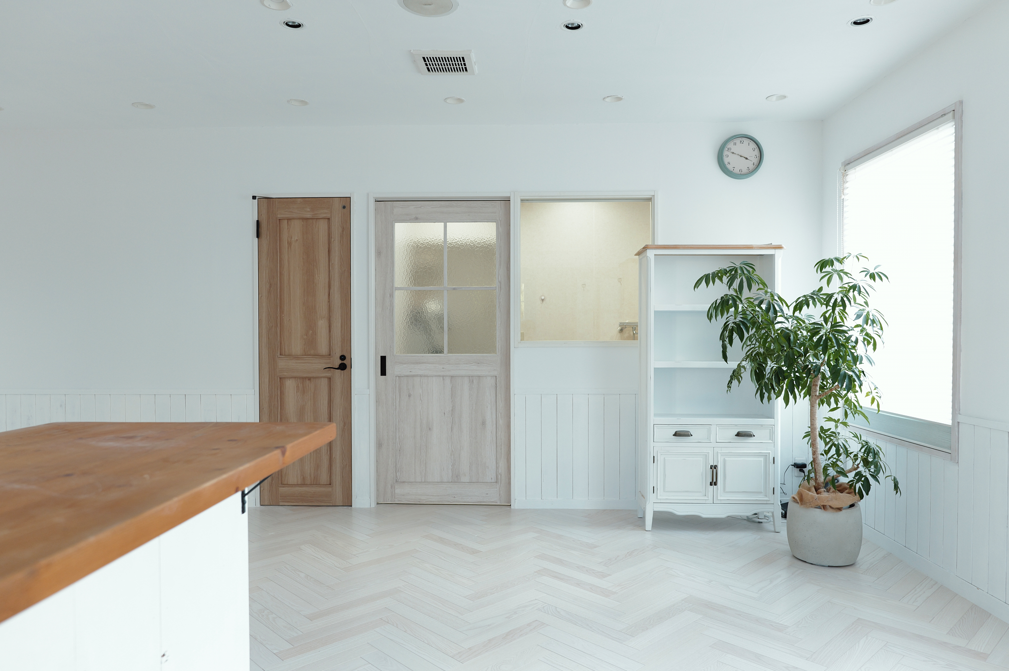 室内は漆喰で囲まれた白のワンルームのお部屋。ルームシューズでお家のような綺麗な環境でトリミングを行っています。自由に過ごしながらお迎え待ち。